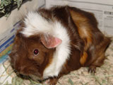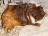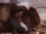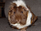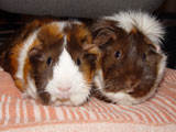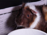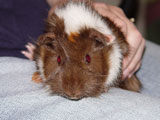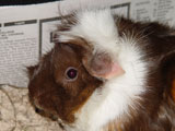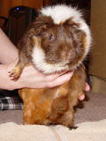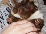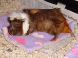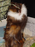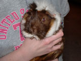 We got Noriko and her sister Saki on October 29, 2006, after we had lost Aya and Hazel. We visited many different pet stores until we found just the right guinea pigs for us. In the store, when I held Noriko for the first time, she just melted into my hands - she was so cute and tiny and was so comfortable with being held. Their coloring was so pretty, and since they looked so alike we're pretty sure they were from the same litter. When we got them home, Noriko made such a silly first impression by running straight into the wall of the cage.