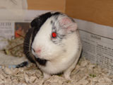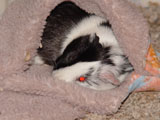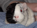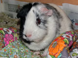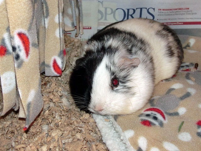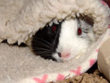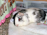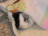 As with her split color face, Tatiana also had a split personality. She could be the sweetest pig in the world, like when she took care of Saki, and also the rudest pig we've ever had. She didn't much enjoy being out of her cage, but she loved to be petted and was the best purr-er of all of our pigs. However, her first reaction to something surprising her was to retaliate with a bite, never more than a nip, but you had to pay close attention when you were petting her. She'd also grab hold of sleeves to make you pay attention to her if you were petting another pig instead of her. Tatiana was also a scaredy cat. She was loud and full of personality when she was around the two of us, but if anyone new was around, she shut down and retreated into herself. One time, Liz brought her to the vet and she described Tatiana as becoming a blob, which was the furthest from her normal personality.