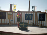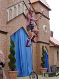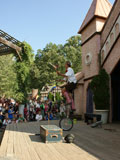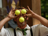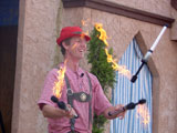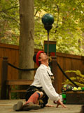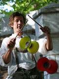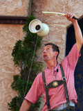 Hilby: The Skinny German Juggle Boy, is a hilarious and talented performer who draws in some of the biggest crowds we've ever seen at the faire. He juggles a variety of different objects over the course of his show including balls, shaker cups, bowling balls, plungers, knives, torches, and juggling pins. He also rides a unicycle with a child from the audience on his shoulders, and ends his show by juggling different objects on top of a tall unicycle. Hilby always gets a great reaction from the huge crowds that he gets, and the audience is always willing to participate (especially when he gets out his bullwhip and demands you get on stage). He even gets everyone to sing along to The Sound of Music while he attempts to set his hair on fire!